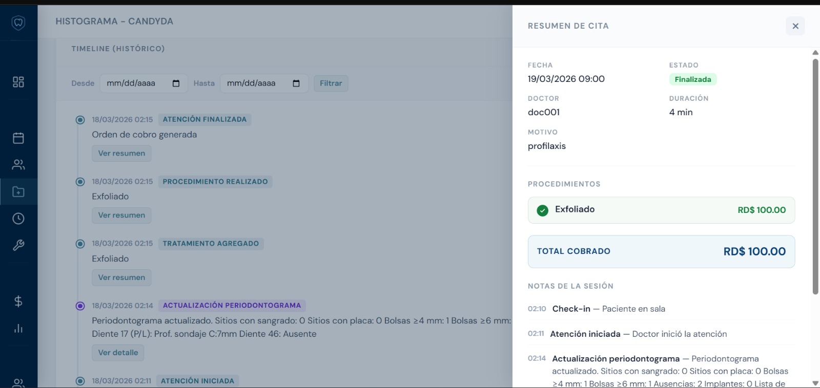 El doctor documenta procedimientos, odontograma y firma el consentimiento.